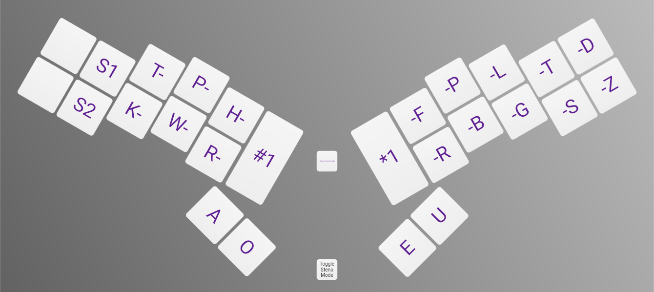 The layout includes 24 keys used for the normal steno layout, and 2 additional keys on the left pinky which are not assigned function out-of-the-box, but can be used to switch layers, or extend the layout with extra keys using the plover-stenotype-extended plugin.